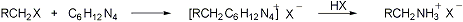 | 96. | Delépine Reaction (Delépine Amine Synthesis) M. Delépine, Compt. Rend. 120, 501 (1895); 124, 292 (1897). Preparation of primary amines by reaction of alkyl halides with hexamethylenetetramine followed by acid hydrolysis of the formed quaternary salts: