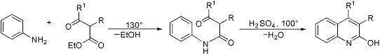 | 217. | Knorr Quinoline Synthesis L. Knorr, Ann. 236, 69 (1886); 245, 357, 378 (1888). Formation of α-hydroxyquinolines from β-ketoesters and arylamines above 100°. The intermediate anilide undergoes cyclization by dehydration with concentrated sulfuric acid: