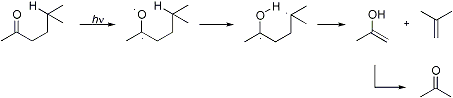 Norrish Type II Cleavage: Reaction originating from the nπ* excited state of aldehydes and ketones that involves intramolecular γ-hydrogen abstraction followed by cleavage of the resulting diradical to an olefin and an enol which tautomerizes to the carbonyl compound: