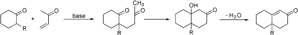 | 342. | Robinson Annulation W. S. Rapson, R. Robinson, J. Chem. Soc. 1935, 1285. Formation of six-membered ring α,β-unsaturated ketones by the addition of cyclohexanones to methyl vinyl ketone (or simple derivatives of methyl vinyl ketone) or its equivalents, followed by an intramolecular aldol condensation, q.v.: