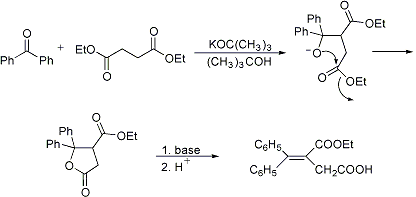 | 380. | Stobbe Condensation H. Stobbe, Ber. 26, 2312 (1893); Ann. 282, 280 (1894). Condensation of aldehydes or ketones with diethyl succinate in the presence of a strong base to form monoesters of α-alkylidene (or arylidene) succinic acids: