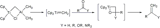 | 392. | Tebbe Olefination (Methylenation) F. N. Tebbe et al., J. Am. Chem. Soc. 100, 3611 (1978); S. H. Pine et al., ibid. 102, 3270 (1980). Exchange of the oxygen atom of a carbonyl function for the methylene group of the proposed titanium carbene complex (the Tebbe reagent) to yield terminal alkenes: