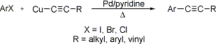 | 70. | Castro-Stephens Coupling (Stephens-Castro Coupling, Castro Reaction) C. E. Castro, R. D. Stephens, J. Org. Chem. 28, 2163 (1963); R. D. Stephens, C. E. Castro, ibid. 3313; A. M. Sladkov et al., Bull. Acad. Sci. USSR, Div. Chem. Sci. 1963, 2043. The coupling of cuprous acetylides with aryl halides to yield arylacetylenes: