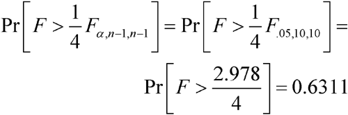 This could be calculated using a computer spreadsheet. For example, in Microsoft® Excel the formula would be: FDIST((R/A) *FINV(alpha, n 1, n 1), n 1, n 1), where R is the ratio of variances at which to determine power (e.g., R = 1, which was the value chosen in the power calculations provided in the above table) and A is the maximum ratio for acceptance (e.g., A = 4). Alpha is the significance level, typically 0.05.