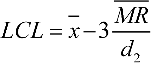 where x is the sample mean, and d2 is a constant commonly used for this type of chart and is based on the number of observations associated with the moving range calculation. Where n = 2 (two consecutive measurements), as here, d2 = 1.128. For the example in Figure 1, the MR was 1.7: