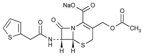 5-Thia-1-azabicyclo[4.2.0]oct-2-ene-2-carboxylic acid, 3-[(acetyloxy)methyl]-8-oxo-7-[(2-thienylacetyl)amino]-, monosodium salt, (6R-trans)-. Monosodium (6R,7R)-3-(hydroxymethyl)-8-oxo-7-[2-(2-thienyl)-acetamido]-5-thia-1-azabicyclo[4.2.0]oct-2-ene-2-carboxylate acetate (ester) » Cephalothin Sodium contains the equivalent of not less than 850 µg of cephalothin (C16H16N2O6S2) per mg, calculated on the dried basis.