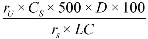in which rU and rS are the peak responses for the Test solution and the Working standard solution, respectively; CS is the concentration, in mg per mL, of the Working standard solution; 500 is the volume, in mL, of Medium; D is the dilution factor of the Test solution; 100 is the conversion factor to percentage; and LC is the label claim, in mg.