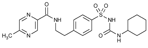 Pyrazinecarboxamide, N-[2-[4-[[[(cyclohexylamino)carbonyl]amino]sulfonyl]phenyl]ethyl]-5-methyl-. 1-Cyclohexyl-3-[[p-[2-(5-methylpyrazinecarboxamido)ethyl]phenyl]sulfonyl]urea » Glipizide contains not less than 98.0 percent and not more than 102.0 percent of C21H27N5O4S, calculated on the dried basis.