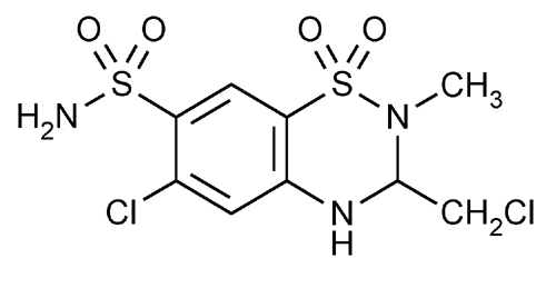 2H-1,2,4-Benzothiadiazine-7-sulfonamide, 6-chloro-3-(chloromethyl)-3,4-dihydro-2-methyl-, 1,1-dioxide, (±)-. (±)-6-Chloro-3-(chloromethyl)-3,4-dihydro-2-methyl-2H-1,2,4-benzothiadiazine-7-sulfonamide 1,1-dioxide » Methyclothiazide contains not less than 97.0 percent and not more than 102.0 percent of C9H11Cl2N3O4S2, calculated on the dried basis.