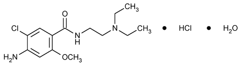 Benzamide, 4-amino-5-chloro-N-[2-(diethylamino)ethyl]-2-methoxy-, monohydrochloride, monohydrate. 4-Amino-5-chloro-N-[2-(diethylamino)ethyl]-o-anisamide monohydrochloride monohydrate » Metoclopramide Hydrochloride contains not less than 98.0 percent and not more than 101.0 percent of C14H22ClN3O2·HCl, calculated on the anhydrous basis.