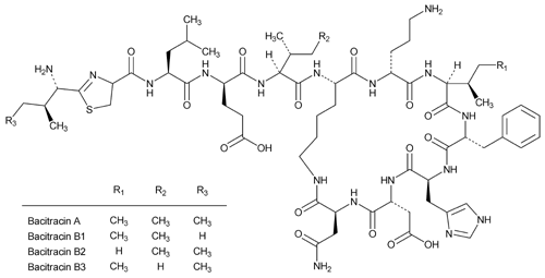 » Bacitracin is a mixture of polypeptides produced by the growth of an organism of the licheniformis group of Bacillus subtilis (Fam. Bacillacaea), the main components being bacitracins A, B1, B2, and B3. It has a potency of not less than 65 Bacitracin Units per mg, calculated on the dried basis.