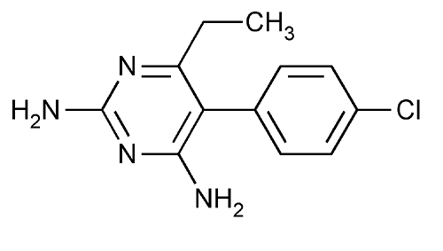 2,4-Pyrimidinediamine, 5-(4-chlorophenyl)-6-ethyl-. 2,4-Diamino-5-(p-chlorophenyl)-6-ethylpyrimidine » Pyrimethamine contains not less than 99.0 percent and not more than 101.0 percent of C12H13ClN4, calculated on the dried basis.