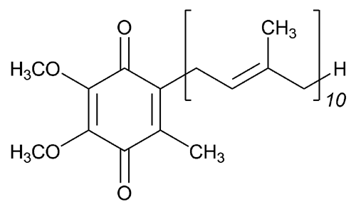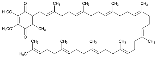 2,5-Cyclohexadiene-1,4-dione, 2-[(2E,6E,10E,14E,18E,22E,26E,30E,34E)-3,7,11,15,19,23,27,31,35,39-decamethyl-2,6,10,14,18,22,26,30,34,38-tetracontadecaenyl]-5,6-dimethoxy-3-methyl. 2-[(all-E)-3,7,11,15,19,23,27,31,35,39-Decamethyl-2,6,10,14,18,22,26,30,34,38-tetracontadecaenyl)-5,6-dimethoxy-3-methyl-p-benzoquinone » Ubidecarenone (Coenzyme Q10) contains not less than 98.0 percent and not more than 101.0 percent of C59H90O4, calculated on the anhydrous basis.