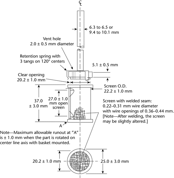 Shaft and basket components of the stirring element are fabricated of stainless steel, type 316, or other inert material, to the specifications shown in Figure 1. A basket having a gold coating of about 0.0001 inch (2.5 µm) thick may be used. A dosage unit is placed in a dry basket at the beginning of each test. The distance between the inside bottom of the vessel and the bottom of the basket is maintained at 25 ± 2 mm during the test.