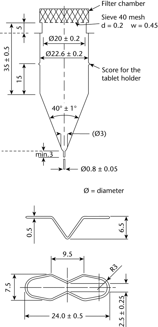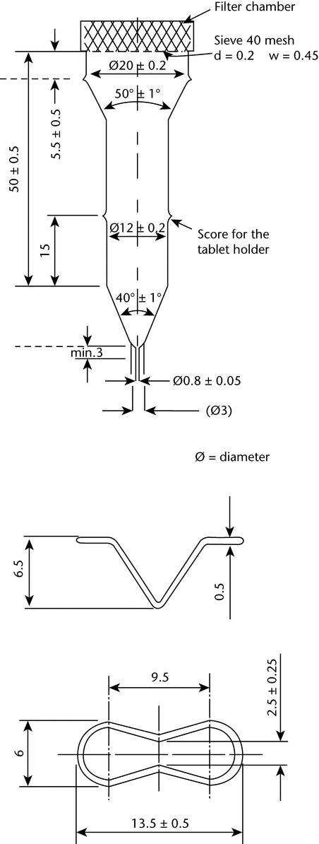 Figure 5. Apparatus 4, small cell for tablets and capsules (top), tablet holder for the small cell (bottom). (All measurements are expressed in mm unless noted otherwise.)