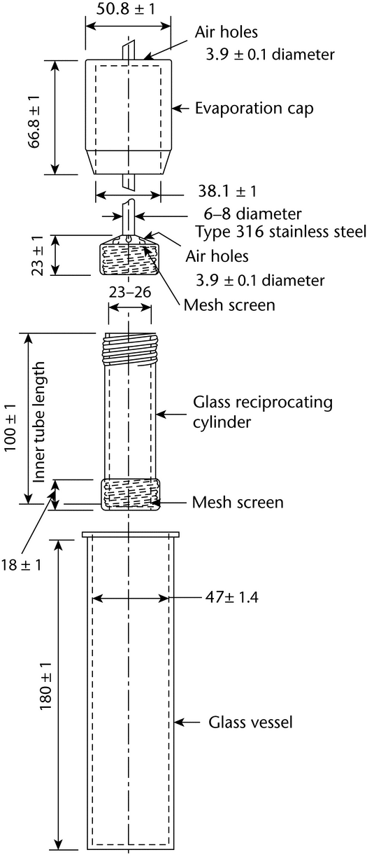 The assembly consists of a set of cylindrical, flat-bottomed glass vessels; a set of glass reciprocating cylinders; inert fittings (stainless steel type 316 or other suitable material), and screens that are made of suitable nonsorbing and nonreactive material and that are designed to fit the tops and bottoms of the reciprocating cylinders; and a motor and drive assembly to reciprocate the cylinders vertically inside the vessels and, if desired, index the reciprocating cylinders horizontally to a different row of vessels. The vessels are partially immersed in a suitable water bath of any convenient size that permits holding the temperature at 37 ± 0.5 during the test. No part of the assembly, including the environment in which the assembly is placed, contributes significant motion, agitation, or vibration beyond that due to the smooth, vertically reciprocating cylinder. A device is used that allows the reciprocation rate to be selected and maintained at the specified dip rate given in the individual monograph within ±5%. An apparatus that permits observation of the specimens and reciprocating cylinders is preferable. The vessels are provided with an evaporation cap that remains in place for the duration of the test. The components conform to the dimensions shown in Figure 3 unless otherwise specified in the individual monograph.