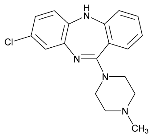 Clozapine: 11, 11¢-(piperazine-1,4-diyl)bis(8-chloro-5H-dibenzo(b,e)(1,4)diazepine.
