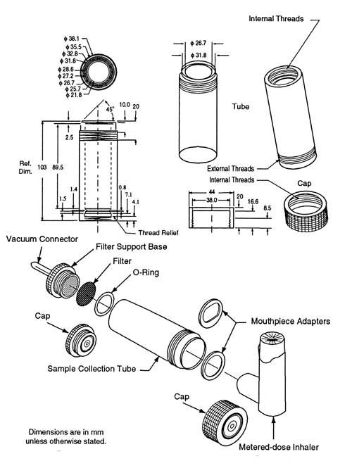 consists of a filter support base with an open-mesh filter support, such as a stainless steel screen, a collection tube that is clamped or screwed to the filter support base, and a mouthpiece adapter to ensure an airtight seal between the collection tube and the mouthpiece. Use a mouthpiece adapter that ensures that the opening of the inhaler mouthpiece is flush with the front face or 2.5-mm indented shoulder in the sample collection tube, as appropriate. The vacuum connector is connected to a system comprising a vacuum source, flow regulator, and flowmeter. The source should be capable of pulling air through the complete assembly, including the filter and the inhaler to be tested, at the desired flow rate. When testing metered-dose inhalers, air should be drawn continuously through the system to avoid loss of drug into the atmosphere. The filter support base is designed to accommodate 25-mm diameter filter disks. At the airflow being used, the sample collection tube and the filter disk must be capable of quantitatively collecting the Delivered Dose. The filter disk and other materials used in the construction of the apparatus must be compatible with the drug and the solvents that are used to extract the drug from the filter. One end of the collection tube is designed to hold the filter disk tightly against the filter support base. When assembled, the joints between the components of the apparatus are airtight so that when a vacuum is applied to the base of the filter, all of the air drawn through the collection device passes through the inhaler.