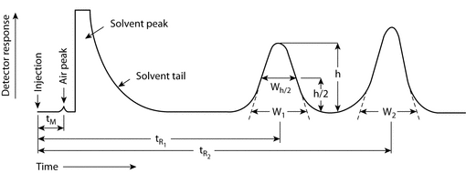 Figure 1 represents a typical chromatographic separation of two substances, 1 and 2. tR1 and tR2 are the respective retention times; and h is the height, h/2 the half-height, and Wh/2 the width at half-height, for peak 1. W1 and W2 are the respective widths of peaks 1 and 2 at the baseline. Air peaks are a feature of gas chromatograms and correspond to the solvent front in LC. The retention time of these air peaks, or unretained components, is designated as tM.