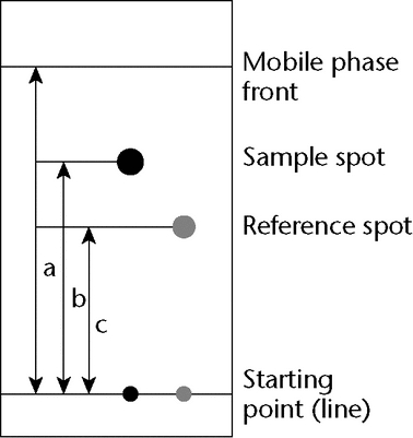 The retardation factor is the ratio of the distance traveled by the center of the spot to the distance simultaneously traveled by the mobile phase and is used in planar chromatography. Using the symbols in Figure 3:
