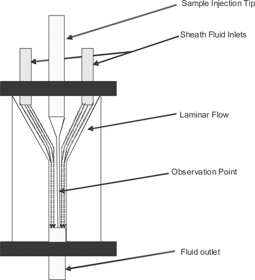 The fluidics system moves a bulk mixture of cells so that a stream of single cells is formed. Within the flow cytometer, the single-cell suspension passes through a confined region where each cell is sequentially illuminated by a uniform light source at the observation point (interrogation point). Most instruments use a flow chamber (flow cell) that, after the cell sample is drawn into the sample injection tip, combines the cells with isotonic sheath fluid, using a conical nozzle assembly that is geometrically designed to produce a laminar flow of fluid (Figure 1). The fluid outlet nozzle typically has an orifice of 50250 µm in diameter through which fluid exits at a high flow rate. Differential pressures between the sample stream of cells (lower pressure) and the sheath stream (higher pressure) draw the cells/particles out into a confined stream. The resulting coaxial stream within a stream is highly efficient, and the sample stream at the observation point is typically only slightly larger than the cells or particles contained within. At least one manufacturer uses an alternative approach in which the coaxial stream strategy is replaced by the use of microcapillaries to focus and direct the cells. The light signal deflected or emitted by the cell is then measured and analyzed.