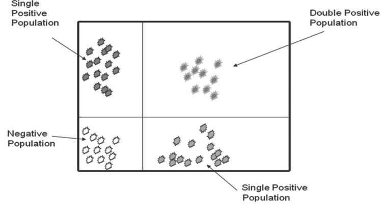 When cells are stained with antibodies for different epitopes carrying two different fluorochromes, the data are presented as a plot of the two parameters plotted against each other. Cursors can be set on each axis to separate positive populations from negative populations for each of the attributes. This results in a graphic representation of cells that are positive for both markers, negative for both markers, and positive for only one of the two markers (Figure 6).