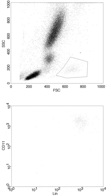 Figure 7. Gating of a cell population with low side scatter and high forward scatter, which is distinct from other cell populations in the sample.