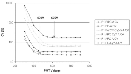 On newer digital instruments it is desirable to establish a baseline setup of instrument settings that provide optimal sensitivity. This setup is not a daily procedure but should be performed if the instrument configuration is changed or if the instrument is serviced. Because PMT voltages and instrument configuration can strongly affect instrument sensitivity, this method should be used to provide objectivity as well as improved sensitivity. PMT voltages can be increased to a range that provides a lower CV (Figure 8). These settings can be, but may not always be, used for the biological assay.