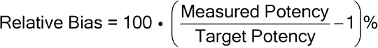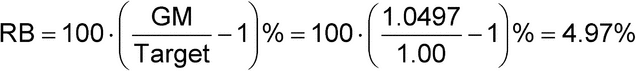 Here the GM of the relative potency measurements is calculated as the anti-log of the average log relative potency measurements and then expressed as relative bias, the percent deviation from the target potency: