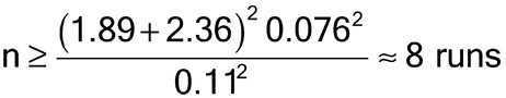 Thus eight runs would be needed in order to have a 95% chance of passing the target acceptance criterion for relative bias if the true relative bias is zero. Note that the calculation of sample size assumes that a singlet of the validation samples will be performed in each validation run. The use of multiple replication sets and/or multiple assays will provide valuable information that allows separate estimates for intra-run and inter-run variability, and will decrease the risk of failing to meet the validation target acceptance criteria.