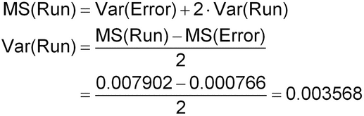 The between-run component of variability, Var(Run), is subsequently calculated by setting the mean square for Run to the mathematical expression for the expected mean square, then solving the equation for Var(Run) as follows: