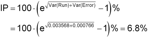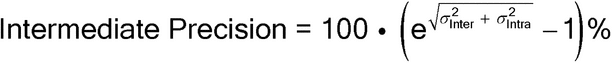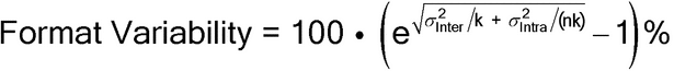 corresponding to intra-run and inter-run variation. These can be used to estimate the IP of the bioassay, as well as the variability of the reportable value for different bioassay formats (format variability). IP expressed as percent geometric coefficient of variation (%GCV) is given by the following formula, in this case using the natural log of the relative potency in the analysis (see section 2.7 Statistical Considerations, Scale of Analysis):