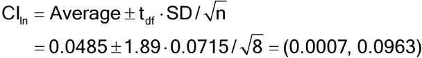 Estimates of bioassay validation parameters should be presented as a point estimate together with a confidence interval. A point estimate is the numerical value obtained for the parameter, such as the GM or %GCV. A confidence intervals most common interpretation is as the likely range of the true value of the parameter. The previous example determines a 90% confidence interval for average log relative potency, CIln, as follows:
