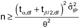 Note that this formulation of sample size assumes no intrinsic bias in the bioassay. A more conservative solution includes some nonzero bias in the determination of a sample size. This results in a greater sample size to offset the impact of the bias on the conclusions of the validation. In the current example the sample size increases to 10 runs if one assumes an intrinsic bias equal to 2%. Note also that this calculation represents a recursive solution (because the degrees of freedom depend on n) requiring statistical software or an algorithm that employs iterative methodology.