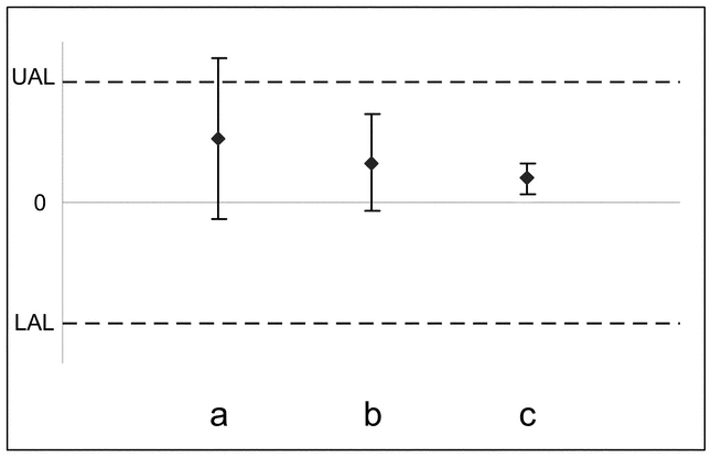 The solid horizontal line represents the target value (perhaps 0% relative bias), and the dashed lines form the lower (LAL) and upper (UAL) acceptance limits. In scenario a, the confidence bound includes the target, and thus one could conclude there is insufficient evidence to conclude a difference from target (the significance test approach). However, although the point estimate (the solid diamond) falls within the acceptance range, the interval extends outside the range, which signifies that the true relative bias may be outside the acceptable range. In scenario b, the interval falls within the acceptance range, signifying conformance to the acceptance criterion. The interval in scenario c also falls within the acceptance range but excludes the target. Thus, for scenario c, although the difference of the point estimate from the target is statistically significant, c is acceptable because the confidence interval falls within the target acceptance limits.
