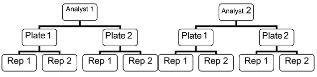 Figure 2 illustrates an example of a validation using nesting (replicates nested within plate, plate nested within analyst).