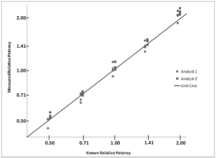 A plot is used to reveal irregularities in the experimental results. In particular, a properly prepared plot can reveal a failure in agreement of validation results with validation levels, as well as heterogeneity of variability across levels (see discussion of the log transformation in section 2.7 Statistical Considerations). The example plot in Figure 3 includes the unit line (line with slope equal to 1, passing through the origin). The analyst 1 and analyst 2 data are deliberately offset with respect to the expected potency to allow clear visualization and comparison of the data sets from each analyst.