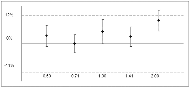 Figure 4 shows an average positive bias across sample levels (i.e., the average relative bias is positive at all levels). This consistency is due in part to the lack of independence of bioassay results across levels. In addition there does not appear to be a trend in relative bias across levels. The latter would indicate that a comparison of samples with different measured relative potency (such as stability samples) is biased, resulting perhaps in an erroneous conclusion. Trend analysis can be performed using a regression of log relative potency versus log level. Introduction during the development of the bioassay validation protocol of an acceptance criterion on a trend in relative accuracy across the range can be considered.