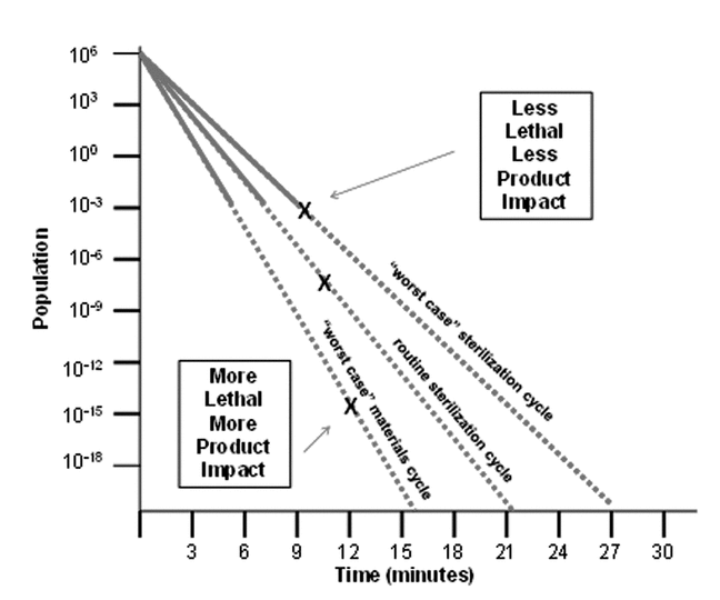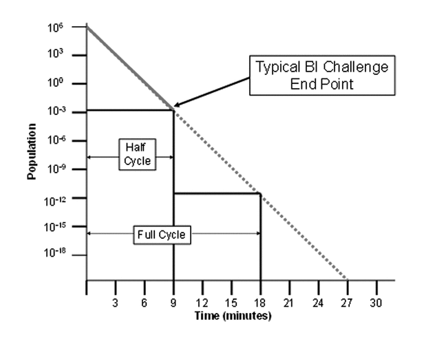 The half-cycle validation method requires the destruction of a high concentration (NLT 106 spores) of a resistant microorganism under defined, minimum conditions for complete kill. This establishes the minimum lethal process dwell time. In routine operation, the process dwell period is arbitrarily doubled and supports a theoretical reduction of the biological indicator (and thus the bioburden) to a probability of a nonsterile unit (PNSU) of 10
