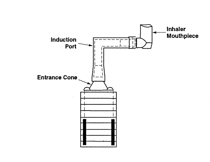A suitable cascade impactor is available as Model Mk II from Thermo-Electron, 27 Forge Parkway, Franklin, MA 02038. The impactor is used without the pre-separator. The product is connected to the impactor via the induction port atop the entrance cone shown in Figure 6. If an equivalent impactor is employed, the induction port in Figure 6a should be used, although the entrance cone (Figure 6b) should be replaced with one to fit the impactor in question. Note that the internal surfaces of the induction port (Figure 6a) are designed to fit flush with their counterparts in the entrance cone (Figure 6b). This design avoids aerosol capture at the junction of the two pipes.