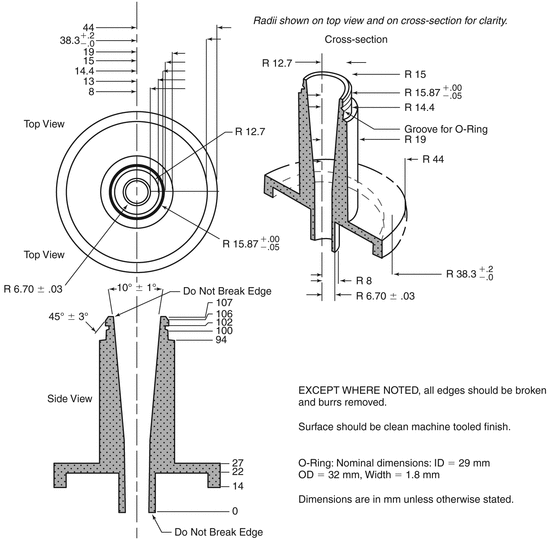 Figure 6b. Apparatus 1: Expanded view of the entrance cone for mounting induction port on the Andersen cascade impactor without pre-separator. Material can be aluminum, stainless steel, or other suitable material. Surface roughness (Ra) should be approximately 0.4 µm.