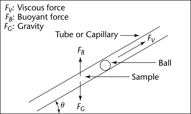 Apparatus: See Figure 1. The basic design of a rolling ball viscometer consists of a tube (or capillary) that contains the sample liquid under test and a ball chosen so that it will require a minimum rolling time of 20 s at the measuring angle in the sample liquid.