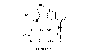 Literature References: Antibiotic polypeptide complex produced by Bacillus subtilis and B. licheniformis; mixture of at least nine bacitracins of which bacitracin A is the major component. Isoln: Johnson et al., Science 102, 376 (1945); Anker et al., J. Bacteriol. 55, 249 (1948). Purification of bacitracin by carrier displacement method: Porath, Acta Chem. Scand. 6, 1237 (1952). Purification with ion exchange resin: Chaiet, Cochrane, US 2915432 (1959 to Merck & Co.). Production: Johnson, Meleney, US 2498165 (1950 to the U.S. Secy. of War); Freaney, Allen, US 2828246 (1958 to Commercial Solvents). Solubilities: Weiss et al., Antibiot. Chemother. 7, 374 (1957). Preliminary structure studies: Hausmann et al., J. Am. Chem. Soc. 77, 723 (1955); Lockhart et al., Biochem. J. 61, 534 (1955); Stoffel, Craig, J. Am. Chem. Soc. 83, 145 (1961). Structure of bacitracin A: Ressler, Kashelikar, ibid. 88, 2025 (1966); Galardy et al., Biochemistry 10, 2429 (1971). Synthetic studies: Munekata et al., Bull. Chem. Soc. Jpn. 46, 3187, 3835 (1973). Mechanism of action: Storm, Ann. N.Y. Acad. Sci. 235, 387 (1974). Comprehensive description: G. A. Brewen, Anal. Profiles Drug Subs. 9, 1-69 (1980). Reviews: Craig et al., "Bacitracin" in G. E. W. Wolstenholme, C. M. O'Connor, Ciba Foundation Symposium on Amino Acids and Peptides with Antimetabolic Activity (Little, Brown, Boston, 1958) pp 226-246; E. D. Weinberg in Antibiotics, D. Gottlieb, P. D. Shaw, Eds. (Springer-Verlag, New York, 1967) I, pp 90-99; II, pp 240-245; D. R. Storm, W. A. Toscano, Jr. in Antibiotics vol. 5, pt. 1, F. E. Hahn, Ed. (Springer-Verlag, New York, 1979) pp 1-17.