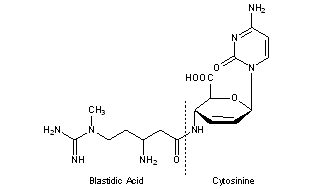 CAS Name: 4-[[3-Amino-5-[(aminoiminomethyl)methylamino]-1-oxopentyl]amino]-1-(4-amino-2-oxo-1(2H)-pyrimidinyl)-1,2,3,4-tetradeoxy-b-D-erythro-hex-2-enopyranuronic acid