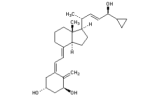 Literature References: Vitamin D3 analog with low calcemic activity. Prepn: M. J. Calverley, E. T. Binderup, WO 8700834; eidem, US 4866048 (1987, 1989 both to Leo Pharm.); M. J. Calverley, Tetrahedron 43, 4609 (1987). Pharmacology: L. Binderup, E. Bramm, Biochem. Pharmacol. 37, 889 (1988); P. J. Marie et al., Bone 11, 171 (1990). Receptor binding: T. Valaja et al., Biochem. Pharmacol. 40, 1827 (1990). Review of clinical trials in psoriasis: D. M. Ashcroft et al., Br. Med. J. 320, 963-967 (2000).