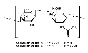 Literature References: Mol wt estimated at 50,000 depending on source and method of prepn: Schubert, Fed. Proc. 17, 1099 (1958). High viscosity mucopolysaccharides (glycosaminoglycans) with N-acetylchondrosine as a repeating unit and with one sulfate group per disaccharide unit. These biological polymers act as the flexible connecting matrix between the tough protein filaments in cartilage to form a polymeric system similar to reinforced rubber. Chondroitin 4-sulfate and chondroitin 6-sulfate are the most abundant mucopolysaccharides in the body and occur both in skeletal and soft connective tissue. Isoln: Bray et al., Biochem. J. 38, 142 (1944); Patat, Elias, Z. Physiol. Chem. 316, 1 (1959); Kasavina et al., SU 157466 (1962); Wheat, Davidson, Biochem. Prep. 10, 52 (1963); Haneno, JP 64 7650 (1964 to Yasushi Hano). Structure: Davidson, Meyer, J. Am. Chem. Soc. 77, 4796 (1955). Absorption spectrum of A: Orr, Biochim. Biophys. Acta 14, 173 (1954); of B + C: Mathews, Nature 181, 421 (1958). Clinical trials in atherosclerosis: K. Nakazawa, K. Murata, J. Int. Med. Res. 6, 217 (1978); eidem, Z. Alternsforsch. 34, 153 (1979). Reviews: K. Meyer, "Chondroitin Sulfates" in Polysaccharides in Biology, Trans. 4th Conf. 1958, G. F. Springer, Ed. (Josiah Macy Jr. Foundn., New York, 1959) p 11; Muir, Am. J. Med. 47, 673-690 (1969); Rodén, Pure Appl. Chem. 35, 181-193 (1973). Review of clinical use in osteoarthritis: T. E. McAlindon et al., J. Am. Med. Assoc. 283, 1469-1475 (2000). See also Chondrosine.