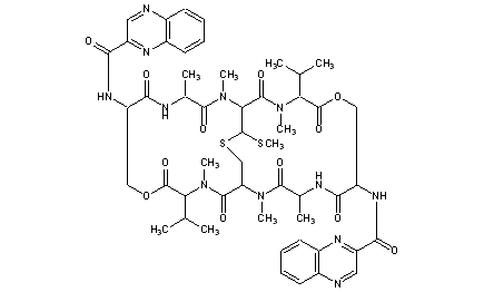 Literature References: A "quinoxaline antibiotic" similar to the triostins, q.v.: Kuroya, Ishida, J. Antibiot. 14A, 324 (1961). Powerful, selective inhibitor of nucleic acid synthesis in vitro. Produced by Streptomyces echinatus from soil of Cuanza (Angola): Corbaz et al., Helv. Chim. Acta 40, 199 (1957). Structure: Keller-Schierlein et al., ibid. 42, 305 (1959). Revised structure: Dell et al., J. Am. Chem. Soc. 97, 2497 (1975); D. G. Martin et al., J. Antibiot. 28, 332 (1975). Identity with quinomycin A: Katagiri, Sugiura, Antimicrob. Agents Chemother. 1961, 162. Biosynthesis: Arif et al., Indian J. Biochem. 7, 193 (1970). Isoln and properties of the other quinomycins: Yoshida, Katagiri, J. Antibiot. 14A, 330 (1961); Otsuka, Shoji, ibid. 19A, 128 (1966); eidem, Tetrahedron 23, 1535 (1967). Conformation in soln: H. T. Cheung et al., J. Am. Chem. Soc. 100, 46 (1978). Review of chemistry and biochemistry of echinomycin: M. J. Waring in Antibiotics vol. 5(pt. 2), F. E. Hahn, Ed. (Springer-Verlag, New York, 1979) pp 173-194.