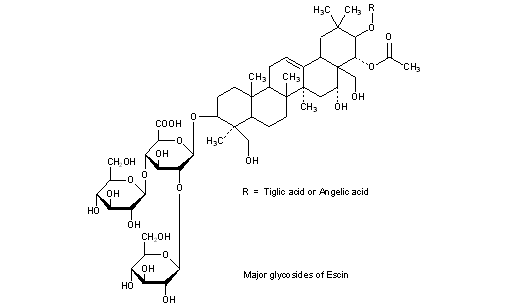 Literature References: A mixture of saponins occurring in the seed of the horse chestnut tree, Aesculus hippocastanum L., Hippocastanaceae: Winterstein, Z. Physiol. Chem. 199, 25 (1931); Steiner, Holtzem in Paech-Tracey, Moderne Methoden der Pflanzenanalyse III (Springer-Verlag, 1955) p 117. Isoln by chromatography and purification: Fiedler, Arzneim.-Forsch. 4, 213 (1953); using ion-exchange resins: Erbring et al., US 3238190 (1966 to Madaus). Previously thought to be built up from the aglycon escigenin, glucuronic acid, glucose and xylose: Jermstadt, Waaler, Pharm. Acta Helv. 28, 265 (1953); Patt, Winkler, Arzneim.-Forsch. 10, 273 (1960); Tschesche et al., Ann. 669, 171 (1963). Structural studies indicate that the two major glycosides in the mixture are built up from the aglycon, protoescigenin, which is acylated at C-22 by acetic acid, and from the sugar moiety, glucuronic acid and two D-glucose molecules. The two aglycons differ only at the C-21 position which is acylated by either angelic acid or tiglic acid, q.q.v. Structure and stereochemistry: Wulff, Tschesche, Tetrahedron 25, 415 (1969); Wagner et al., Arzneim.-Forsch. 20, 205 (1970); eidem, Z. Physiol. Chem. 351, 1133 (1970). Early work identified two forms, a-escin and b-escin: Wagner, Basse, ibid. 320, 27 (1960). Identity of prosaponin B with b-escin: Voigtlander, Rosenberg, Arzneim.-Forsch. 13, 385 (1963). b-Escin is the natural form and can be converted to a-escin: Wagner, Schlemmer, US 3450691 (1969 to Klinge); Wagner et al., Arzneimittel-Forsch., loc. cit. Pharmacology: H. Hampel et al., ibid. 20, 209 (1970); Lang, Mennicke, ibid. 22, 1928 (1972). Review: Tschesche, Wulff in Fortschr. Chem. Org. Naturst. 30, 461-606 (1973). Review of pharmacology and clinical experience: C. R. Sirtori, Pharmacolog. Res. 44, 183-193 (2001).