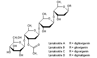 Literature References: Family of four glycosides, A, B, C, D, isolated from various species of Digitalis including D. lanata Ehrh., Scrophulariaceae: Stoll, Kreis, Helv. Chim. Acta 16, 1049 (1933); Ligeti, Pharmazie 12, 433 (1957); 14, 162 (1959); Angliker et al., Ann. 607, 131 (1957); D. Lutea L., Scrophulariaceae: Cole, Gisvold, J. Am. Pharm. Assoc. Sci. Ed. 47, 654 (1958). Structure: Tschesche et al., Ber. 92, 2258 (1959); Uskert, Ann. 638, 199 (1960); Kuhn et al., Helv. Chim. Acta 45, 881 (1962). Absorption spectrum: Bell, J. Am. Pharm. Assoc. Sci. Ed. 49, 277 (1960). Cardioactivity of lanatoside C: K.-O. Haustein, Pharmacology 11, 117 (1974). Mitogenicity: L. L. G. Hammarström, C. I. E. Smith, J. Immunol. 120, 694 (1978). HPLC determn: V. Y. Davydov et al., J. Chromatogr. 248, 49 (1982); of lanatoside C: F. Orosz et al., Anal. Biochem. 156, 171 (1986).