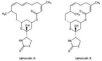 Literature References: Highly potent toxins which disrupt microfilament organization by binding the actin monomer. Isolated from the Red Sea sponge Latrunculia magnifica Keller; also found in the Pacific nudibranch Chromodoris elisabethina and the Fijian sponge Spongia mycofijiensis. Isoln and biological activities: I. Néeman et al., Mar. Biol. 30, 293 (1975). First family of natural products possessing the 2-thiazolidinone moiety; latrunculins A-D are 14- or 16- membered macrolides, infrastructures previously unknown in marine isolates. Structure elucidation of A and B: A. Groweiss et al., J. Org. Chem. 48, 3512 (1983); of A through D: Y. Kashman et al., Tetrahedron 41, 1905 (1985). Chemistry of A and B: D. Blasberger et al., Ann. 1989, 1171. Total synthesis of B: R. Zibuck et al., J. Am. Chem. Soc. 108, 2451 (1986); of A: J. D. White, M. Kawasaki, J. Am. Chem. Soc. 112, 4991 (1990); of A, B, C and M: A. B. Smith, III et al., ibid. 114, 2995 (1992). Comparative study with cytochalasin D, q.v., on the effects actin organization and cell processes: I. Spector et al., Cell Motil. Cytoskel. 13, 127 (1989). Inhibition of the actin monomer: W. M. Morton et al., Nat. Cell. Biol. 2, 376 (2000). Review of use as research tool: K. Ayscough, Methods Enzymol. 298, 18-25 (1998).